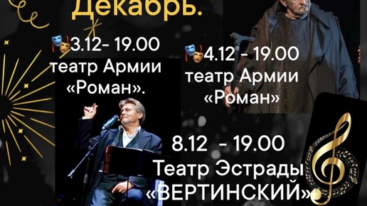 Афиша на декабрь. Утончённый Вертинский музыкальный спектакль, «Маскарад» - роль Арбенина. «Роман»- мессир Воланд.