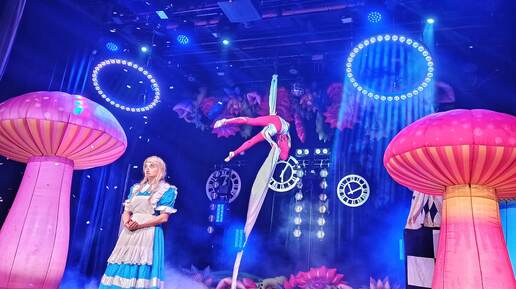 Для меня Цирк Чудес был первым моим московским театром,с которым я познакомилась. И моя любовь по отношению к нему длится до сих пор! Посмотрев несколько представлений,я была поражена музыкальными данными их артистов, цирковыми гимнастами и разнообразным репертуаром. Я побывала на многих спектаклях. В этот раз мы с сыном сходили на постановку- "Алиса в Стране Чудес". Главными героями в спектакле были:Алиса,Шляпник и Кролик. По сюжету персонажи едут в поезде и на каждой станции они сталкиваются с приключениями ,и вместе находят выход из различных ситуаций...