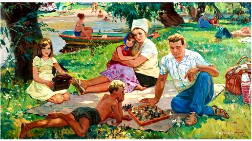 Всем утра доброго, дня отменного, вечера уютного, ночи покойной, лета пристойного, ave, salute или как вам угодно! Обратите внимание - как культурно (любимое в советском обиходе - причём, возможно, и не у самых культурных граждан - словцо) отдыхают на картине граждане! Шахматы, термос с чаем, в сумке - по всей вероятности - бутерброды (до них пока не дошло), транзистор... Вдалеке народ тоже - просто загорает. Или купается. На заднем плане - "скорая": вдруг что случится? Хотяяя... вряд ли! Что тут...