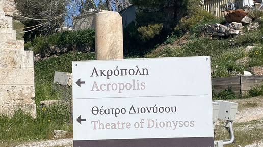 По дороге на Парфенон встречаем мраморный амфитеатр, посвящённый богу виноделия Дионису. В конце IV века до нашей эры 67 рядов мраморных сидений театра могли вмещать до 17000 зрителей, что составляло примерно половину Афин. Якобы здесь ставились постановки трех великих драматургов-трагиков — Эсхила, Софокла и Еврипида...