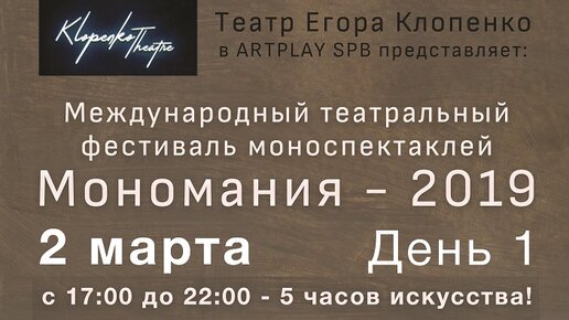 Фестиваль моноспектаклей "Мономания" День 1.Театр Егора Клопенко в ARTPLAY SPB представляет международный фестиваль моноспектаклей «Мономания». Фестиваль будет идти весь год, а по его результатам лучшие моноспектакли получат премии и войдут в постоянный репертуар театра. Моноспектакли – малая форма театрального искусства и именно поэтому она является самой чистой и честной. В моноспектаклях между актером и зрителями нет ничего лишнего, ничего что могло бы скрыть нечестность и неискренность. Любая фальшь здесь сразу становится явной и очевидной...