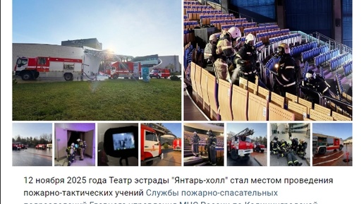 В Светлогорске сегодня народ был напуган потоком пожарных машин, мчащихся по Калининградскому проспекту. Оказалось, что это были учения (тренировка) пожарников в театре эстрады "Янтарь холл". В этих учениях были задействованы пожарно-спасательные части Калининграда, Светлогорска, Пионерского, Зеленоградска, Балтийска и Светлого. Театр эстрады "Янтарь холл" на своем официальном ресурсе сообщает: "12 ноября 2025 года "Янтарь-холл" стал местом проведения пожарно-тактических учений Службы пожарно-спасательных подразделений ГУ МЧС России по Калининградской области...