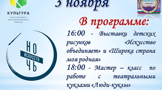 🌌 Мероприятия в Городском Дворце культуры г. Туапсе в рамках акции "Ночь искусств" ⏰3 ноября 2025 года с 16:00 💬 Участниками ИЗО-студии «Фантазия» в фойе Городского Дворца культуры города Туапсе будет оформлена выставка детских рисунков – «Искусство объединяет», на которой дети представят разные виды и жанры искусства, пейзажи, натюрморты и портреты. А руководитель ИЗО-студии «Фантазия» представит портреты работников Городского Дворца культуры города Туапсе...