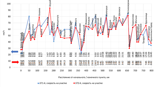 Вот и снова у нас север европейской части. И на удивление похожи по многим параметрам оказались маршруты поездов №371/372 сообщением Архангельск-Котлас и Тайшет-Усть-Илимск (см. предыдущий обзор). У каждого перелом маршрута почти под 90 градусов. Протяженность тоже очень близка - 797 / 787 км. И оба маршрута по кривизне не уложились в требуемый для "без штрафа" уровень <1,5. Скорость у каждого из них также в интервале 40-50 км/ч. А вот количество остановок прилично отличается. У нашего сибирского...