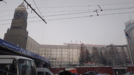 Хочу показать и рассказать вам об одном из моих любимых мест в Красноярске. Находится оно в самом центре города, на левом берегу реки Енисея. Автобусная остановка, с которой начнется наша прогулка, называется "Театр оперы и балета". Через эту остановку проходят несколько городских автобусных и троллейбусных маршрутов, соединяющих центр Красноярска с жилыми кварталами правого берега. Через дорогу от остановки виднеется длинное строение, в котором размещаются офисы городской администрации. Издалека...