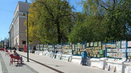 Прогулка у нас уже на четвёртую статью растянулась, а это я только точечно про какие-то достопримечательности пешеходной улицы Нижнего Новгорода рассказываю. ☺ Помните про Арбат спрашивала, похожа ли на него наша Покровка? Так вот участок, где точно похожа. За оградой корпус Университета им. Лобачевского, а на ограде - уличный вернисаж. Здесь же на столиках и сувенирные магниты, фигурки, изделия из кожи и дерева. 🖼 Художники -шаржисты также предлагают свои услуги. Но можно и не шуточный портрет заказать...