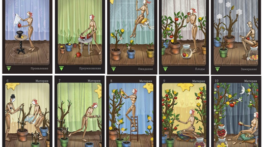 Здравствуйте! Одним из главных достоинств колоды Театр кукол является четкая, логически выверенная нумерологическая последовательность числовых младших арканов, показывающая эволюцию масти от Туза до Десятки. Особенно мне нравится, что тут каждая карта имеет свое название. Они показывают, как одно вытекает из другого, как один процесс последовательно сменяется другим. Возьмем для примера стихию земли, которая в этой колоде называется Материей, и на основе ее сюжетов проследим развитие масти пентаклей...