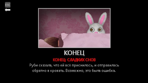 Концовка I - «Конец сладких снов» Это секретная плохая концовка, которую можно получить буквально в самом начале игры, также вместе с этим финалом вы получите первое достижение. Для получения этого достижения и первой концовки, нужно пройти в комнату родителей, после этого вы получаете задание – «Вернуться в постель». По дороге в комнату вы встретите мистера Хоппа и у вас появится новое задание «Покинуть дом», игнорируйте его и продолжайте идти в комнату Руби
