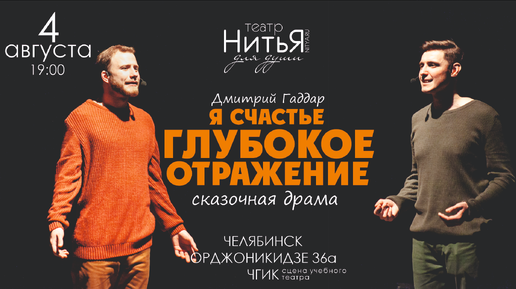В Челябинске со второго по четвертое августа на сцене учебного театра ЧГИК со спектаклями о глубине души и противоречивости человеческих чувств будет выступать творческий союз «НитьЯ». Театр «НитьЯ» - это проводник между зрителем и его ощущения счастья, возможно уже давно забытого в повседневной суете. Театр предлагает вернуть зрителям путеводную нить жизни, благодаря которой безграничные сокровища человеческого сердца станут вновь доступны окружающему миру. Второго августа для челябинцев покажут слезную комедию о любви и семейном быте «Инопланетянцы»...