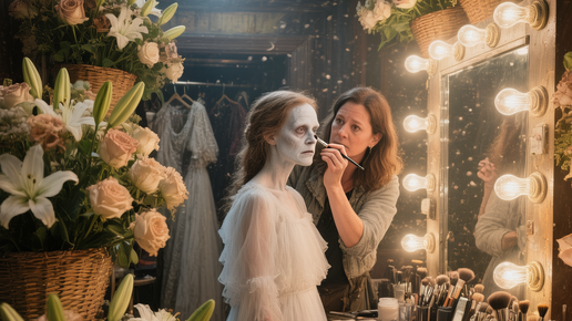 ГЛАВА 6 (Книга 2): ПРЕМЬЕРА За кулисами театра Пасадены пахло пылью, старым деревом, нервным потом и цветами — огромные корзины с розами и лилиями заполняли всё свободное пространство. Эви стояла перед зеркалом в своей уборной, уже одетая в первое, воздушное белое платье Бланш. Гримёрша наносила последние штрихи, делая её лицо бледным, почти прозрачным, с нарисованной хрупкостью. В отражении она видела не себя. Она видела призрак — призрак женщины, которая строила свою реальность из лжи и света кинотеатральных проекторов...
