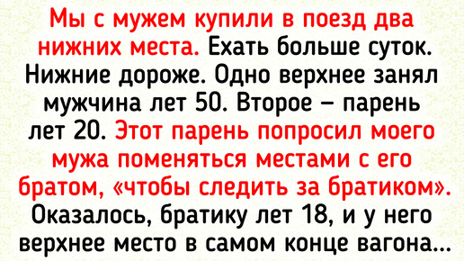 Стук колес, мелодичное дребезжание ложечки в стакане, запах ночного перрона, врывающийся в открытую форточку... Поезд — это место, полное особой романтики, где сами собой возникают курьезные и непредвиденные ситуации. Я [автор ADME] после этих историй поняла: если жизнь кажется скучной, просто купи билет в плацкартный вагон до конечной — приключения найдут тебя сами. Мы с мужем купили в поезд два нижних места. Ехать больше суток. Нижние дороже. Одно верхнее занял мужчина лет 50. Второе — парень лет 20...