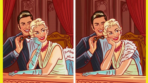 У вас есть шанс проверить свою наблюдательность! Перед вами две ретро-картинки: элегантная пара в театре, улыбки, шикарные наряды… но что-то здесь не так. Найдете 8 отличий всего за 45 секунд? Головоломки на поиск отличий тренируют внимание, ускоряют реакцию и прокачивают концентрацию. Они отлично подходят как детям, так и взрослым. Готовы интересно и с пользой для мозга провести время? Ниже представлены две почти одинаковые картины. На них изображена пара в театре: мужчина с биноклем, женщина в элегантном платье, роскошные красные шторы за их спинами...