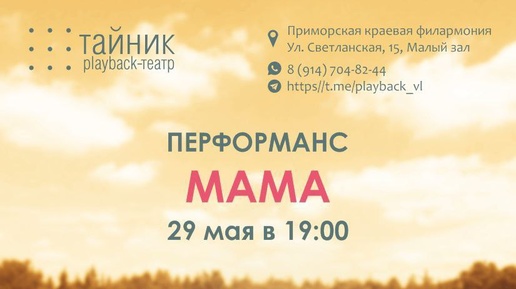 29.05.2025 четверг. #Владивосток Профессиональный плейбэк-театр «Тайник» в перформансе «МАМА» Начало в 19:00 При виде темы перформанса, наверняка вам вспоминаются истории про ваших мам: теплых или холодных, заботливых или постоянно занятых, сильно опекающих или очень дистантных...разных МАМ, которых объединяет одно - они были вашими проводниками в этот удивительный мир...