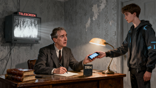 Пыльный кабинет завален книгами и исписанными листами. Воздух густой от запаха старой бумаги и табака. Я очнулся здесь, в самом эпицентре истории, которую знал лишь по учебникам. Передо мной, за простым столом, сидел он - человек с усталым, испещренным морщинами лицом и пронзительным взглядом, в котором читалась вся тяжесть мира. Джордж Оруэлл. Только что была поставлена последняя точка в романе «1984». Я знал, что у меня есть лишь минуты. Достав из кармана невесть откуда взявшийся смартфон, я быстро нашел нужную новость и протянул ему, как вещественное доказательство из грядущего...