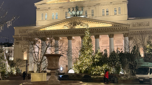 По пути в ЦУМ мы заглянули на Театральную площадь (так называется площадь возле Большого театра). Как раз ночью прошел небольшой снег и где-то даже он ещё не успел растаять!) Все работы по установке и оформлению праздничных декораций завершены. Ёлочки наряжены, фонарики моргают, в окошке горит свет. Перед входом в театр установлена высокая нарядная елка. На территории много блогеров вроде нас. Все фотографируют либо фотографируются. Фотозон здесь много: например, домики. Или фонтан, украшенный громадными цветами...