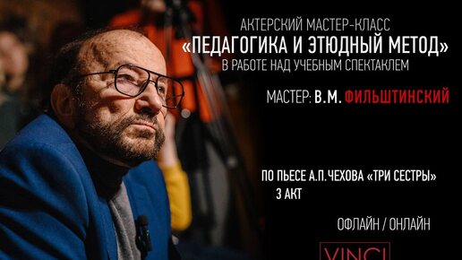 В Театральной гостиной VINCI пройдет мастер-класс с Вениамином Фильштинским «Театральная педагогика и этюдный метод как способ создания спектакля». Мастер-класс проходит в формате практического занятия со студентами лаборатории «Наш Чехов: Три сестры», работающими над созданием учебного спектакля с педагогами магистрантами Фильштинского методами его Мастерской 51 (РГИСИ). На мастер-классе будут представлены работы по третьему акту пьесы, созданные этюдным методом, проявлена природа и логика создания...