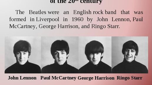 Вчера еще обещала вам, что сегодня расскажу про легендарную английскую группу The Beatles. Рассказываю!) Напишу вам краткую биографию The Beatles на английском и на русском языках и дам некоторые ссылки на их полную биографию и на список альбомов с песнями. В конце публикации будут вопросы по тексту, на которые вы должны будете ответить. Сначала прочитайте текст внимательно на английском, затем на русском и ответьте на вопросы. Проверьте себя по ответам. The Beatles were a legendary English rock band, which was established (признана) in 1959 in Liverpool...