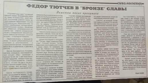 Статья Юрия Фаева о Тютчевском празднике поэзии в Овстуге 1997 года. Была опубликована в газете "Брянское время". ...еще один Тютчевский праздник поэзии. Зачинавшийся сорок лет назад по-домашнему, узкой группой почитателей славного поэта, сегодня праздник «забронзовел». Он стал Официальным Мероприятием со всеми неизбежными последствиями: утомительными речами, банкетами для избранных, установившимся ритуалом при участии определенных гостей и определенной самодеятельности. Именно так проходил – не лучше не хуже – и последний праздник...