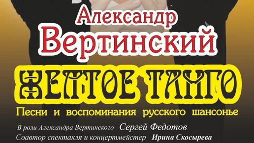 Песни и воспоминания русского шансонье в музыкальном спектакле «Желтое танго» Александр Вертинский 👉 https://yar-filarmoniya.ru/afisha/view.php?af_id=5820 🎭 В роли Александра Вертинского - Сергей Федотов ✍ Соавтор спектакля и концертмейстер - Ирина Скосырева 🎻 Партия скрипки - Дмитрий Акинфин Приходите на захватывающий двухчасовой спектакль, которому в этом году исполнилось 25 ЛЕТ, который смотрится на одном дыхании. Спектакль о жизни. О судьбе. О душе. 👏👏👏 Здесь есть все: трагедия и комедия, боль и красота, томление и надежды, вся жизнь великого Мастера в разные периоды его творчества...