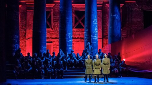 Грандиозный спектакль представили ко Дню Победы артисты театра. Еще до начала на ступенях огромного здания с высокими колоннами на сцене уселись солдаты, а на правой стене расположился портрет неизвестного солдата с горящей перед ним свечой. Декорации и подсветка уже произвели впечатление своим размахом. Зал был полон. Когда действие началось, над нашими головами торжественно пронесли громадное красное полотно, символизирующее Знамя Победы и заиграла "Священная война" - весь зал единым фрoнтом встал...