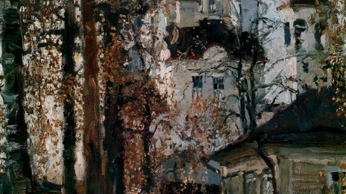 Величественный, светлый храм с куполами цвета неба и деревянный домишко перед ним. Наверное, изображено утро, потому что небе пасмурное, и солнца не видно. Листва на высоких деревьях кажется не золотой, а просто рыжей, тяжелой...