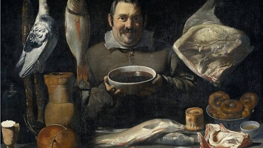 В этой статья рассмотрим картину "Трактирщик", которая раньше приписывалась самому известному средневековому испанскому художнику Диего Веласкесу. Общепринятая трактовка этой картины известна всем: улыбающийся трактирщик решил сделать селфи в оружении еды: птиц,рыб, сыра и колбасы. В центре, как это принято у средневековых художников, символ всего года целиком - лимон в виде круга, разделенного на семь частей. Снизу лежат 6 серебряных монет, 2 золотых, одна кость в виде буквы i или j, и пять кубков, изображенных на картах...