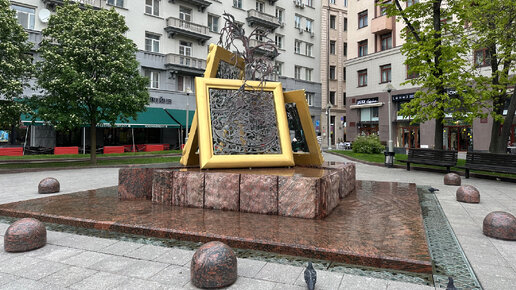 📍м. Третьяковская, Лаврушинский пер. 10 Оригинальный фонтан, выполненный в виде трёх картин, прислонённых друг к другу открыт в 2006 году к празднованию 150-летия Третьяковской галереи в Лаврушинском переулке. Необычный фонтан "Вдохновение" или фонтан искусств создал скульптор А. Руковишников. Для многих, это место отдыха, во время которого можно заняться небольшой загадкой: "что же за полотна зашифрованы в каждой картине?". Ниже первая картина. Присмотритесь, видите дугу? - это стол. На нем ваза, левее что-то квадратное - коробочка, правее колечки - баранки свисают с полки...