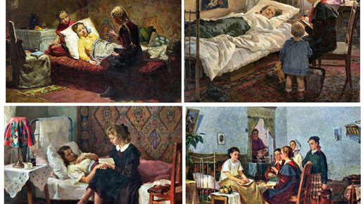 Классика советской живописи. Душевно и понятно без слов. Четыре разных, не связанных между собой художника, написали картины на один и тот же сюжет, который сегодня трудно представить. Первое полотно называется «Помогают больной подружке» (1954). Оно хранится в Вологодской областной картинной галерее. Автор – московский художник Сергей Михайлович Скубко (1922-2007), писавший картины и на историко-революционные темы, и на бытовые. Известны его полотна – «В. И. Ленин в вагоне поезда по пути в Петроград» (1953) и «М...