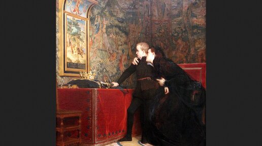 На картине Пьера-Шарля Конта показаны подросток и обнимающая его женщина, оба в черном. Мальчик держится за шпагу. Вид у него решительный. Название этого полотна дает четкую информацию о происходящем: «Жена герцога Гиза берёт со своего сына клятву отомстить за убийство его отца»...