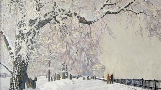 Уже после публикации статьи о снегирях в живописи, в которой значительная часть была посвящена известной и любимой многими картине Николая Ивановича Ульянова "Детский сад. Снегири", а также работам по её мотивам и прямым заимствованиям, попалась мне картина другого Ульянова — Владимира Александровича. Вот такая. Показалось интересным, что здесь зритель смотрит на окно снаружи, и художник показывает и мужчину за этим окном, и снегирей именно зрителю. Мы видим красные грудки, а мужчине видны спинки птиц...