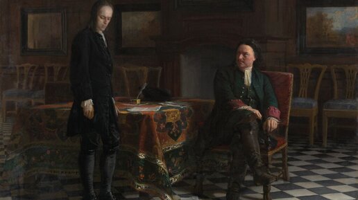 Картина Николая Николаевича Ге "Пётр I допрашивает царевича Алексея Петровича в Петергофе" представляет собой композицию, отображающую важное событие российской истории - допрос царевича Алексея Петровича своим отцом, царем Петром I. На холсте изображены два главных персонажа - царь Петр I и его сын царевич Алексей Петрович. Петр I изображен во всей своей мужественности и властности, смотрящий пристальным взглядом на своего сына. Царевич же изображен в измученном и испуганном состоянии, стоящим перед отцом, опустив голову...