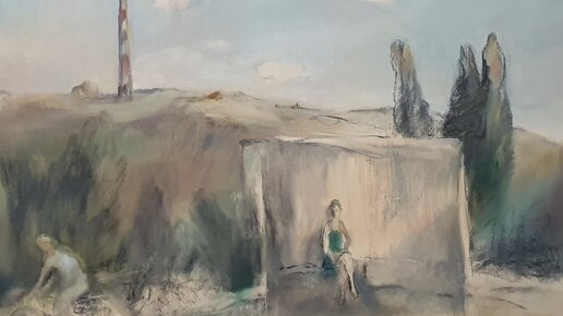 «Немного меланхоличная работа «Лето» дышит жарким воздухом, который растворяется в пыльном мареве. Это ощущение создается за счет землистой цветовой гаммы и очень мягкой живописной манеры. Мы видим небольшую фигурку девушки, которая ожидает транспорт на деревенской остановке или городской окраине. Легкие линии, проведенные углем, оставляют ощущения росчерка и придают филигранность работе. Художница играет на «растворенных формах»,...