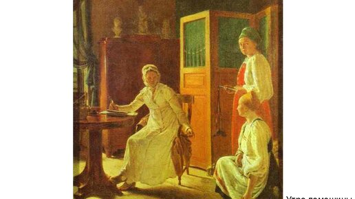 Как же начиналось утро помещицы в 20х годах 19 века? Наверное, с чашки ароматного кофе или чая, ну а затем,пора приняться и за повседневные дела. А что это были за дела? Понаблюдать за этим нам поможет картина Алексея Гавриловича Венецианова " Утро помещицы". В своем кабинете сидя за столиком из красного дерева, держа в руке перо помещица, записывает в свою расчетную книгу сколько льна и кому из крестьян она выдала. На ней светлое утреннее платье и чепец, на стуле лежит дорогая шаль, готовая накрыть ее плечи, если внезапно нагрянет нежданный гость...