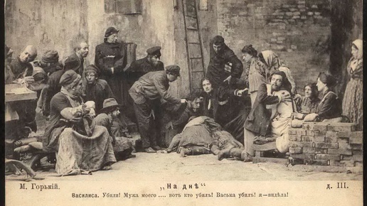 Максим Горький описывает жизнь низшего слоя общества начала 20 века. Герои пьесы живут в ночлежке-подвале, пытаясь свести концы с концами. Эти персонажи – олицетворение бедной жизни после кризиса 1890-ых. Они находятся на самом социальном дне, из которого практически невозможно выбраться. Неожиданно героев посещает старый странник Лука, который вдохнул в некоторых из них жизнь. Его слова заставляют задуматься над смыслом существования и целью жизни. Лука говорил о том, что, если человек чего-то захочет, то обязательно сможет это сделать...