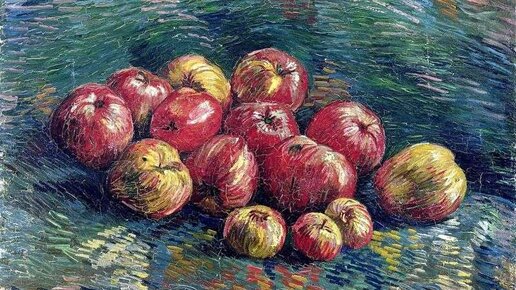 В Париже Ван Гог создает серию натюрмортов с фруктами, при написании которых он оттачивал свое видение цвета и стремился передать его максимально полно и чисто. В этой работе он размещает яблоки красных и желтых оттенков на фоне синей драпировки, которую можно увидеть и на других работах художника этого времени. Здесь в фокусе внимания живописца оказывается контраст теплых и холодных цветов, который делает все краски еще ярче и сочнее. Красно-желтые яблоки гармонично вписываются в это цветовое разнообразие, но в то же время ярко выделяются на нем благодаря контрасту с синим...