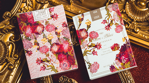 Игральные карты разработаны с этой масляной картиной в качестве визуальной темы, с обильными и красочными цветочными узорами, покрывающими всю колоду, демонстрирующими интенсивные и сложные цвета. Коробка для карт имеет чистый белый фон, причем основным цветом является розовый,...