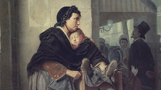 На этой картине мы видим женщину с ребёнком, которая играет на шарманке на одной из парижских улиц. На стойке шарманки прикреплена табличка с просьбой о подаянии, а рядом висит жестяной чайник, в который прохожие бросают деньги. Судя по чёрному чепцу и чёрной шали, женщина — вдова, которая осталась без средств к существованию и теперь вынуждена скитаться с дочкой по улицам города и зарабатывать на хлеб игрой на шарманке. Одежда героини уже поизносилась. Мы можем увидеть потёртый рукав старой кофты и грубые, похожие на мужские, ботинки...