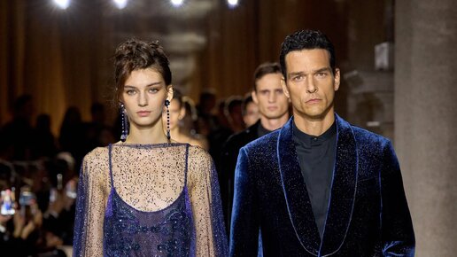 Коллекция звучала в палитре, которая давно стала подписью Армани: greige — серо-бежевый с мягким световым размывом, глубокий синий, васильковый с фиолетовым тоном, насыщенный изумруд. Цвета раскрывались в нюансах: матовые переливы шерсти, текучие линии шелка, бархатистые поверхности, задающие ту самую атмосферу приглушенной роскоши. Силуэты сохранили ту свободу, благодаря которой Armani изменил представление о костюме. Легкие жакеты без жёсткой конструкции, брюки с плавной посадкой, платья с драпировкой...