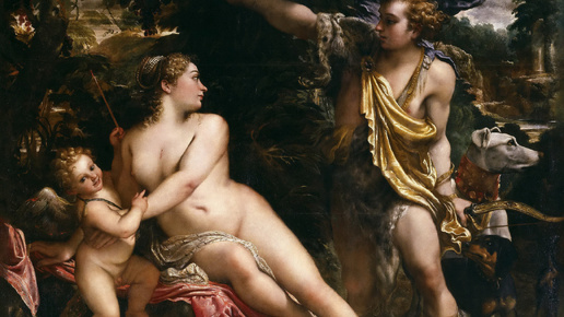Работа «Венера, Адонис и Амур» фокусируется на истории, наиболее известной из которых является история римского поэта Овидия (годы жизни 43 до нашей эры-17 нашей эры). На этой картине Аннибале Карраччи (годы жизни 1560-1609) изображает момент прямо перед тем, как Венера будет поражена стрелой Купидона, в результате чего и влюбится в Адониса, который изображён на полотне с гончими собаками, сопровождавшими его в той самой злополучной охоте на дикого кабана. На переднем плане творения мы видим пару голубей, они символизируют собой любовь...