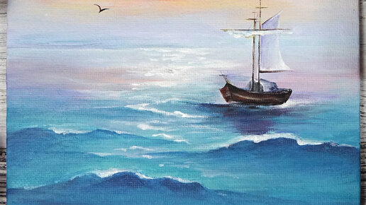 Простой пейзаж с лодкой. Рисовать легко! Морской пейзаж с парусником. Видео МК
