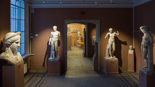 Когда мы наконец завершили вояж по музейным залам Академии художеств, то на первом этаже случайно обнаружили вход в анфиладу со слепками знаменитых скульптурных изваяний. Только ради неё стоит прийти в Академию специально! Мы уже устали от долгого хождения по музейным залам, гудели ноги и спины. Но как можно было упустить такую замечательную возможность? К тому же нам несказанно повезло — на улице уже вечерело, и выхваченные светильниками из полумрака скульптуры очень эффектно смотрелись на фоне синих окон...