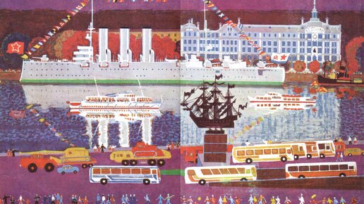 Девяносто три года назад родился художник Виктор Бундин. Мне у него очень нравится книжка-картинка «Город и река», вышедшая в 1985-м году и посвященная Ленинграду и реке Неве. Больше всего она напоминает современный виммельбух. "Здесь нет открытой пропаганды, как в книге Сафоновой, но река тоже остается только фоном для человеческих достижений. Нева втиснута в рамки каменных набережных, история реки, того, откуда она течет, ее характер, художнику не так интересны. Он хотел показать город, бурлящий...