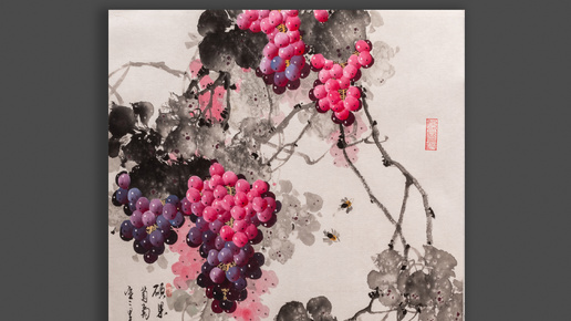 В китайской живописи виноград — один из самых узнаваемых символов. Его изображали ещё в эпоху Тан (VII–X вв.), когда виноград впервые был завезён в Китай из Средней Азии по Великому шёлковому пути. Он быстро стал знаком изобилия и продолжения рода, ведь грозди, полные ягод, напоминали о многочисленных поколениях и семейном благополучии. Картины «Спелый виноград» — пример того, как традиционный мотив превращается в медитацию. На бумаге — лёгкие мазки туши, прозрачные тона, и в то же время — насыщенные фиолетовые и розовые оттенки ягод, от которых будто исходит внутренний свет...
