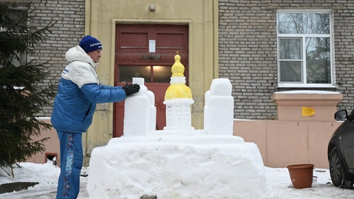 Он уже шестнадцать лет превращает двор на Ланском шоссе в музей Пенсионер делает из снега древнегреческие вазы и узнаваемые достопримечательности Петербурга. За эти годы Кузьмин уже радовал снежной копией Исаакиевского и Казанского соборов, Спаса на Крови, Ростральных колонн, Петропавловской крепости...