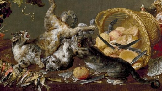 Батальная сцена в натюрморте. Сумеете найти всех котиков на картине? Это популярный у фламандцев тип натюрморта: роскошный стол со снедью, на фоне которого шалят коты. Попробуйте сосчитать, сколько котов изображено на этой картине. Пауль де Вос (1590—1678, Антверпен) - младший брат художника Корнелиса де Воса. Их сестра была замужем за мастером натюрморта Франсем Снейдерсом. Паулю де Восу Снайдерс стал не только родственником, но и учителем. Также младший де Вос работал в мастерской Рубенса (писал животных на его картинах - Рубенс часто прибегал к помощи других художников)...
