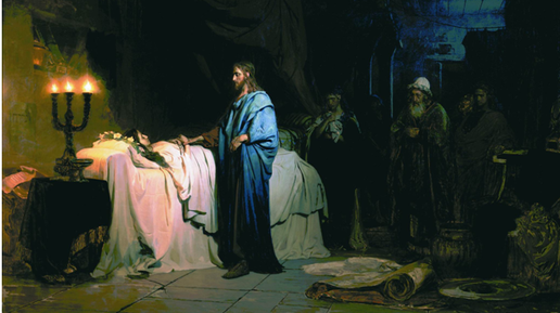 Сюжет для этой картины взят из рассказов Апостолов Иисуса о воскрешении дочери Иаира. Иаир был главным в синагоге, у него заболела дочь, и он пришел к Иисусу с просьбой её исцелить. Двенадцатилетняя девочка находилась при смерти, у нее было сильное кровотечение, которое не могли остановить. Пока отец девочки и Иисус шли в дом к девочке им сообщили, что уже поздно и девочка умерла. Но Иисус сказал Иаиру, чтобы он не отчаивался, они пошли в дом. Иисус вошел в дом со своими апостолами Петром, Иаковом и Иоанном, остальных попросил выйти...
