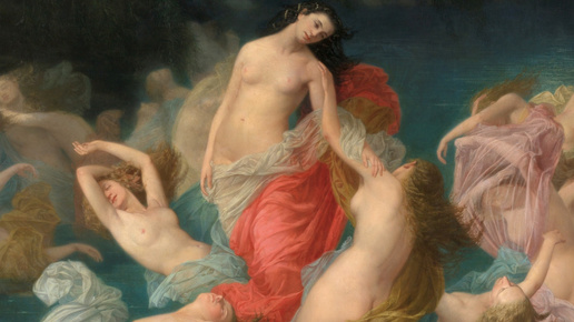 В туманной атмосфере, на поверхности озера, на заднем плане виднеется растительность: большие деревья с ветвями, свисающими над водой. Свет, который освещает композицию, пробивается сквозь верхний правый угол холста. Несколько групп фей медленно погружаются в озеро. Наиболее четко очерчена центральная группа из пяти фигур. Все они частично обнажены, а частично прикрыты разноцветными тканями. Главная фигура меньше всего погружена в воду, и, что любопытно, она единственная с тёмными волосами и вплетенными в них жемчужными лентами...