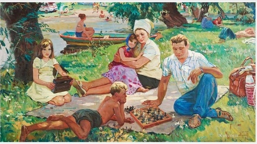 Положительные эмоции вызывает картина «Семья на отдыхе» Николая Бондаренко. Перед нами образцово-показательная семья, которая решила выбраться на пикник летом...