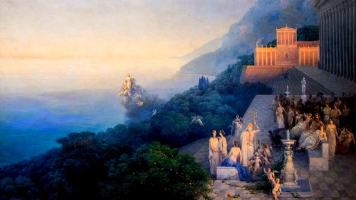 Немногие знают прекрасное полотно маэстро Ивана Константиновича Айвазовского «Встреча Венеры на Олимпе», написанное в 1895 году. Картина размером 213х320 см экспонируется в Феодосийской картинной галерее. На вершине Олимпа, скрытой от простых смертных пеленой тумана, собрались боги. Среди них сразу выделяется фигура громовержца Зевса, перед ним изображен могучий орел – символ главного античного бога. Рядом с Зевсом расположилась прекрасная и жестокая Гера, его супруга, покровительница семьи и брака...