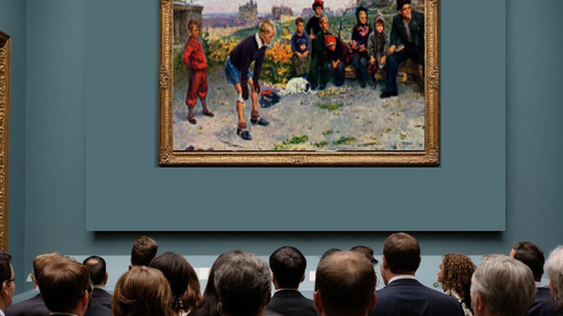 Передо мной картина известного советского художника Сергея Алексеевича Григорьева «Вратарь», написанная в 1949 году. Это полотно удостоено Сталинской премии, и не зря: художнику удалось мастерски передать атмосферу беззаботного детства и радости мирной жизни, которая вернулась в города после войны. В центре сюжета — футбольный матч на пустыре. Главный герой картины — мальчик-вратарь лет двенадцати. Он стоит в воротах, границы которых обозначены просто и по-школьному: с одной стороны лежит потертый портфель, с другой — стопка книг и берет...
